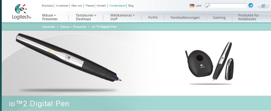 Ich hatte vor einiger Zeit einen Artikel zu paperium geschrieben. Anschließend wurden mir viele andere digitale Stifte empfohlen und es folgten die Artikel zu IRISnotes und livescribe. Heute dann der vierte Artikel zu einem digitalen Stift: dem Logitech io (TM) 2 Digital Pen. Hier ein Screenshot der Webseite: