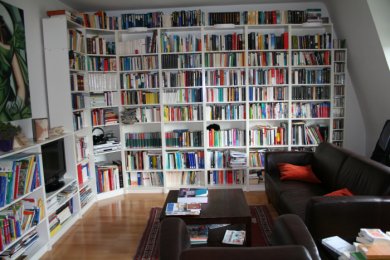 Da ich einen anspruchsvollen Job habe und es abends dauert, bis die beiden Kinder im Bett sind, komme ich meist erst spät zum Bloggen. Ich sitze dann am Kopfende eines großen Holztisches und blicke auf diese Bücherwand: