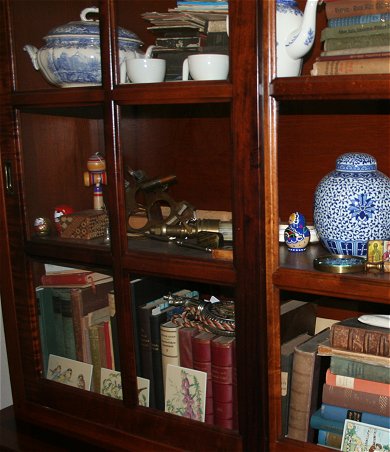 Rechts schaue ich aus dem vierten Stock aus dem Fenster Richtung Osten über Karlsruhe. Links neben mir gibt es einen Schrank mit einer Menge alter Bücher (1888 aufwärts) und viel Kleinkram, den ich auf Flohmärkten rund um den Globus ergattert habe. Dazu einige Erbstücke (altes Geschirr) und alte Notizbücher meiner (Ur-)Großväter. Nichts monetär Wertvolles, aber alles mit Geschichten, die ich gerne erzähle. Hier ein Ausschnitt des Schrankes: