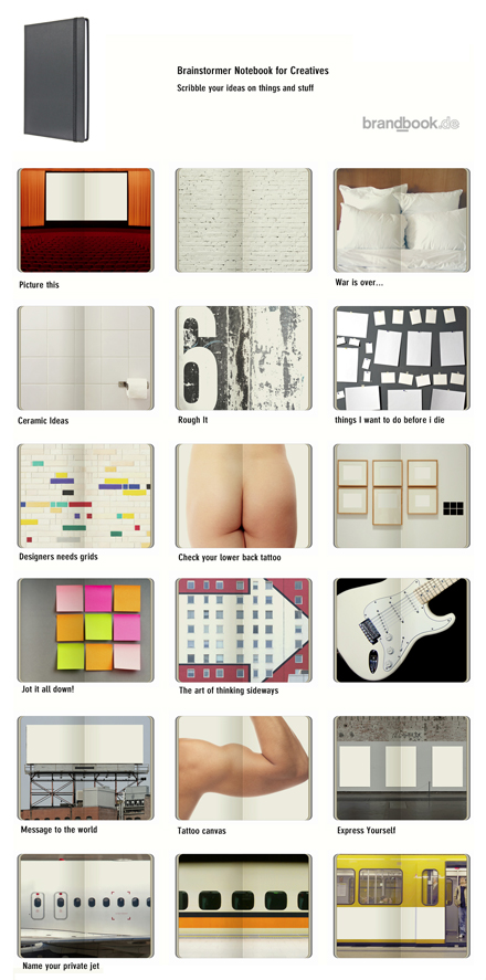 […] Hallo Christian, habe gerade die News zu dem Wall-Notizbuch in Deinem Notizbuchblog gefunden. Etwas ganz ähnliches haben wir vor geraumer Zeit entwickelt und haben es Brainstormer Notizbuch genannt, da die Fotos aus allen Lebensbereichen stammen. So kann man Tattoos auf diversen Körperteile testen, Wände bemalen, Filmszenen skizzieren, seine Stratocaster bearbeiten oder – etwas subversiver– Graffitti auf diverse Verkehrsmittel oder Billboards schmieren. Wir haben für das Buch ca. 90 unterschiedliche Motive ausgewählt, um den Prozess der Ideenfindung etwas zu beflügeln.[…]
