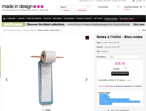 swiss-miss berichtet über die Bloc-Notes, eine endlose Rolle Papier, die wie Klopapier abgerollt wird und beschriftet werden kann. Die Rolle gibt es bei madeindesign.co.uk: